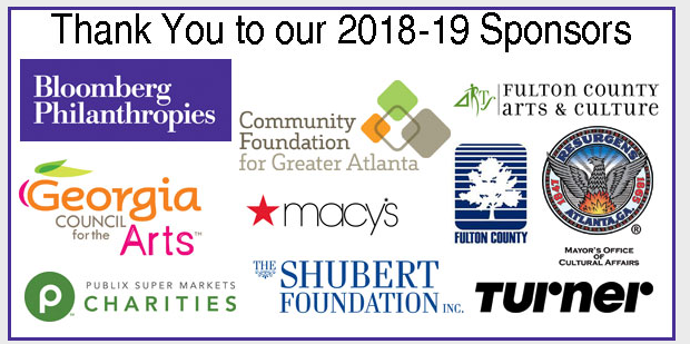 THANK YOU TO OUR SPONSORS: Funding for this program is provided by the Fulton County Board of Commissioners. Major support is provided by the City of Atlanta’s Mayor’s Office of Cultural Affairs. Additional support from: Bloomberg Philanthropies, The Atlanta Journal-Constitution, WSB Radio, Georgia Council for the Arts, Turner Broadcasting, Publix Super Markets Charities, Macy’s, Kilpatrick Townsend, TheShubert Foundation, and the Metropolitan Atlanta Arts Fund of the Community Foundation for Greater Atlanta.
