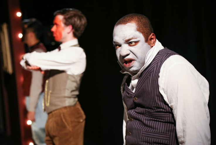 The opening of the play is unconventional, beginning with “The Playwrights” taking the stage in their underwear as if preparing in their dressing rooms for the production. Neal A. Ghant as BJJ — explains a conversation with his imaginary therapist who encouraged him to write the play– and Kyle Brumley –presumably a drunk Boucicault gives his testimony for writing his original version. This seemingly lighthearted opening sets the humorous tone for the production while at the same highlighting the deeper undertones that will be present throughout. It’s during this opening that the three actors prepare by sitting at their make-up tables, making up their faces for the parts they will portray. Both playwrights explain that this is necessary due to the erroneous statement that they couldn’t find actors to play the parts as cast. And so this study of race begins.