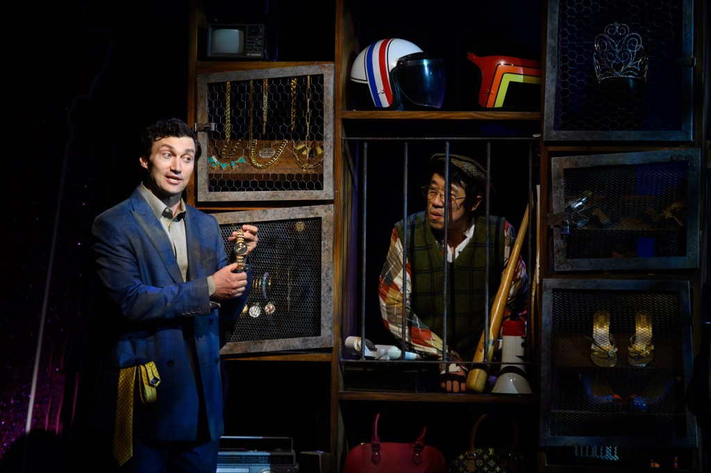 Two characters that I was delighted to see expanded upon were Penelope, played by McKenzie Kurtz, and Beeks, played by Josh Lamon. Each had a number that expanded on their backstories and provided additional character development. Mckenzie Kurtz was the consummate Penelope, conflicted between her upbringing to be the perfect wife and longing to be more. Josh Lamon was hilarious as Beeks in his show-stopping exposition number, breaking both the 4th and, as he explains 5th wall–which is talking back to the characters on stage while off stage in the audience.
