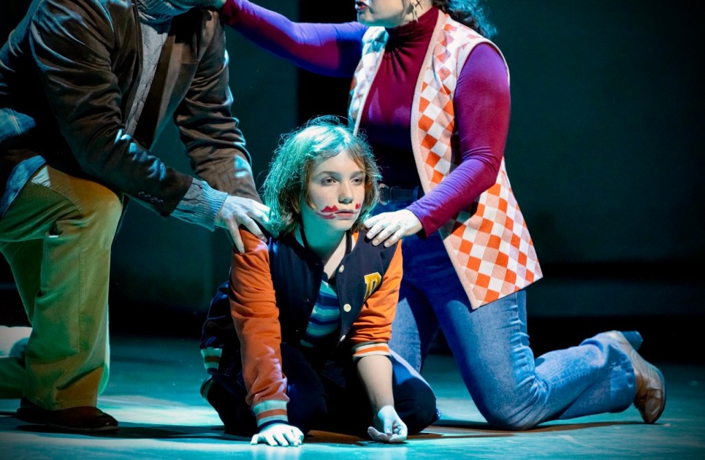 Kudos to the production team for creating an eerie atmosphere the likes of which I’ve never seen on stage. Scenic designer Jacquelyn Scott created a canvas with the set on which lighting designer Jim French and projection designer David Murakami painted an ominous boiler room and a gaggle of ghostly creatures coming and going in and out of the rooms on the interior landing at the top of the stairs. The outdoor scene at the opening created a clever 3-dimensional effect with the use of a scrim, projections, and lighting. the sound design by Jon Summers was expertly mixed and the sound effects with Danny’s possessed voice added an extra amount of chill.