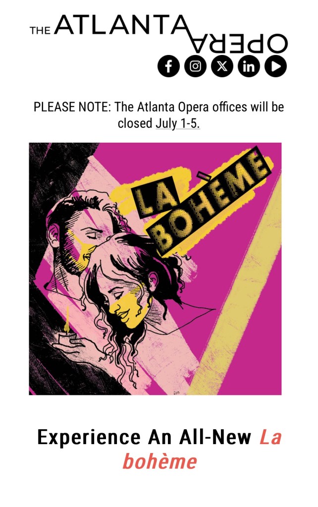 June 28, 2024June 28, 2024 Speakeysie Entertainment Review and Promotion Atlanta Opera’s LA BOHEME: Like you’ve never seen it before Speakeysie News Desk GET YOUR TICKETS!! Share this: Click to share on X (Opens in new window) X Click to share on Facebook (Opens in new window) Facebook Like Loading...