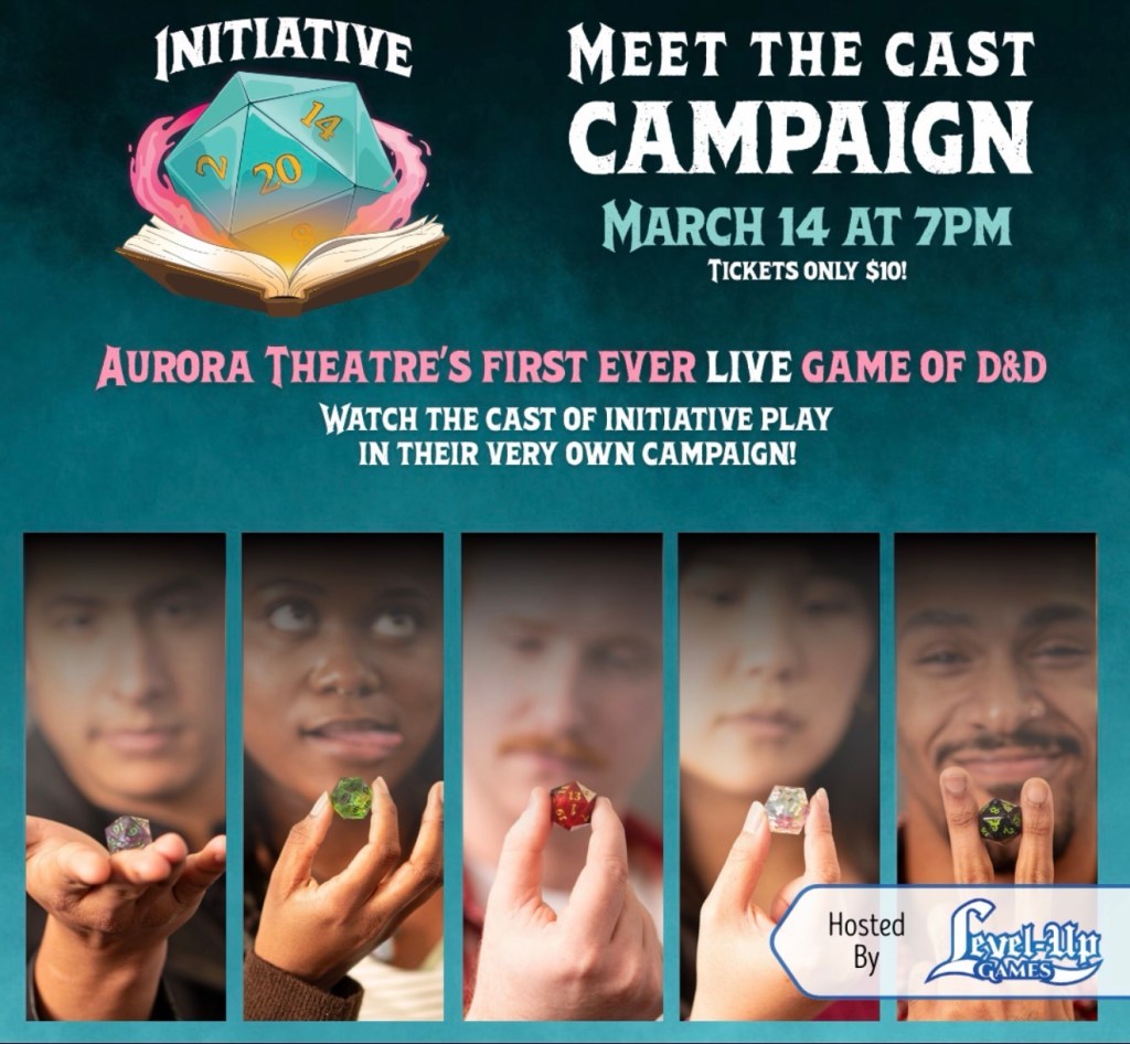 Step inside the adventure with our Meet the Cast Campaign! Join us for a LIVE, one-night-only event to meet the cast and playwright of the world premiere play, Initiative. A night where the actors gather around the table for an epic game of Dungeons & Dragons, all hosted by Brad Williams of Level Up Games.