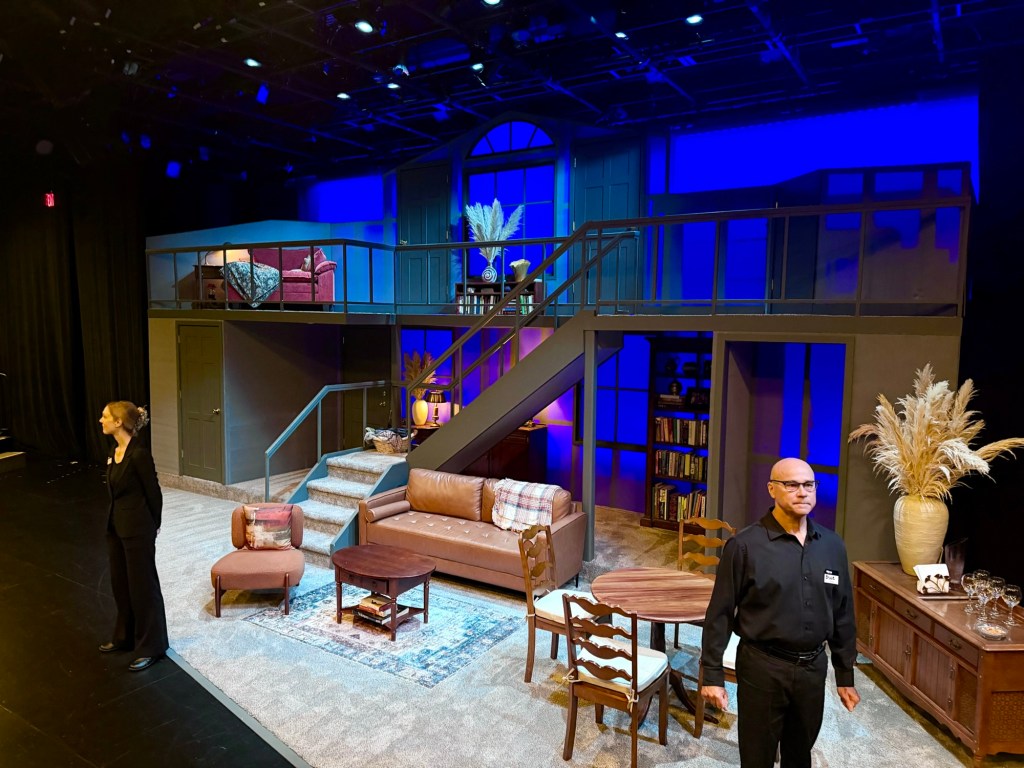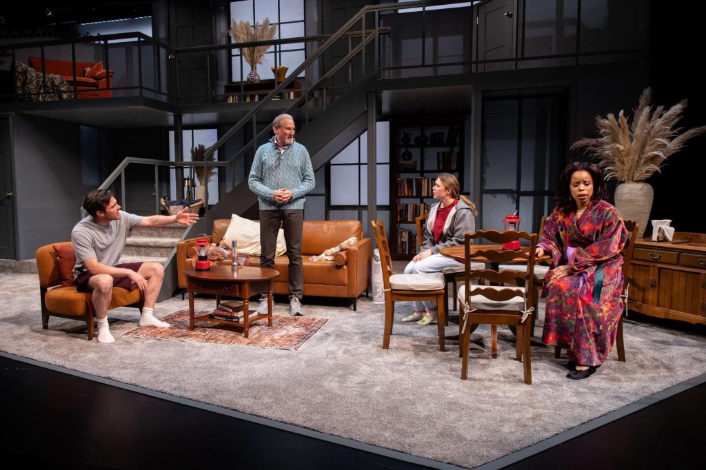 The versatile Hertz Stage was configured as a wide-angle three-quarter thrust for this production. The set, designed by Lex Liang, depicts a tidy living room with a loft accessed by a central staircase. The décor is tasteful and slightly vintage—minimalist, well-kept, and quietly suggesting that the people who live here once had their lives more together than they currently do.