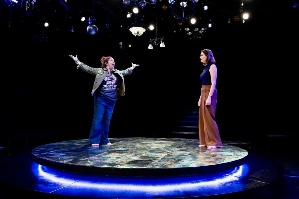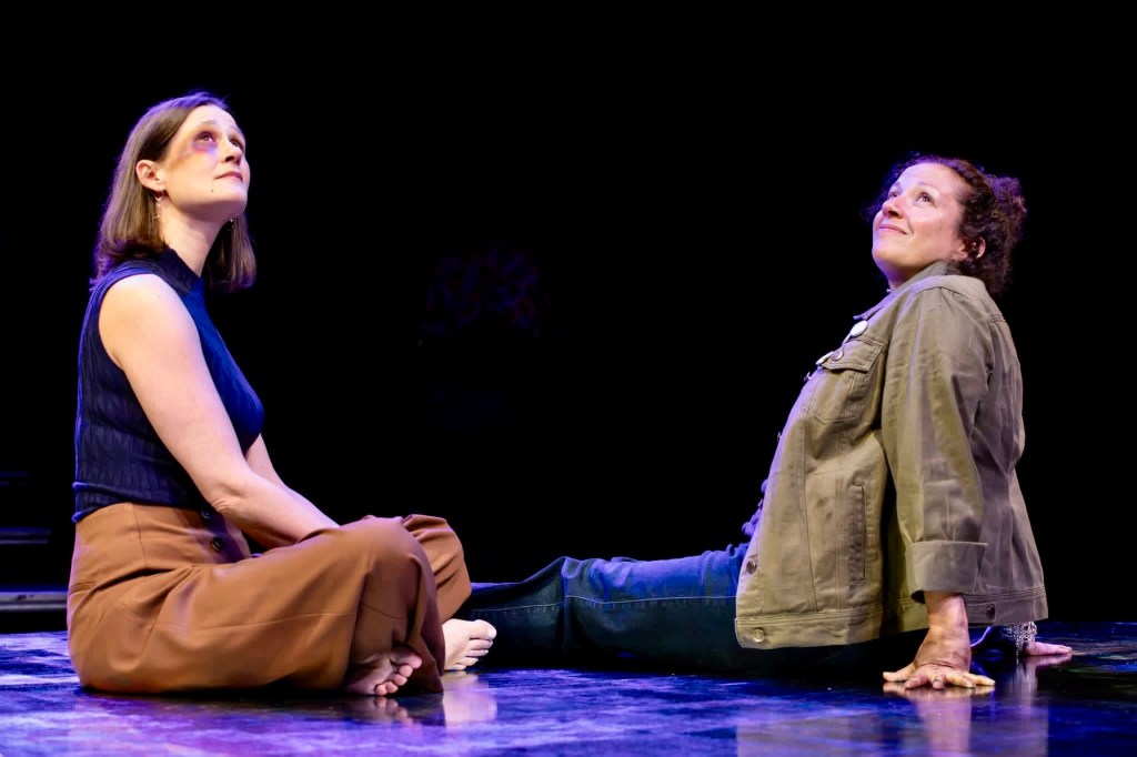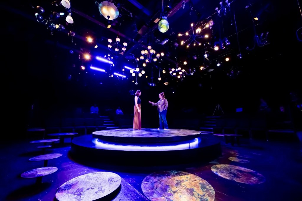 At the center of this circle are Beth (Suehyla El-Attar Young) and Nicole (Kate Donadio MacQueen), a couple circling each other in a shared celestial space that feels nothing like home and everything like an emotional escape room with no clear exit. Something has gone very, very wrong. Instead of addressing it head-on, they talk around it, through it, and occasionally straight past each other. The story unfolds in layers, with the audience essentially dropped in at the end and asked to work backward. As the narrative rewinds and reassembles itself, we get glimpses of Nicole’s childhood—little frozen moments that hint at the origins of her carefully contained (and increasingly uncontained) fears. It’s equal parts devastating and “oh no…this feels familiar.”