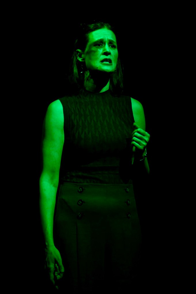 Kate Donadio MacQueen’s Nicole is Beth’s perfect foil: polished, controlled, and quietly unraveling. Dressed in tailored camel-colored sailor pants and a sleek sleeveless top, she projects confidence that quickly proves to be a carefully constructed façade. Through asides, we learn about her childhood—particularly a formative lesson from her father about locking fears away, starting with something as small (and telling) as a spider. Of course, buried fears don’t stay buried, and Nicole’s unraveling becomes both inevitable and unsettling.