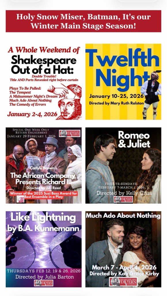 Atlanta- We are placed to reveal the Atlantic Shakespeare companies Winter lineup! We will be at SHAKESPEARE OUT OF A HAT on January 2nd and hope to see you there!